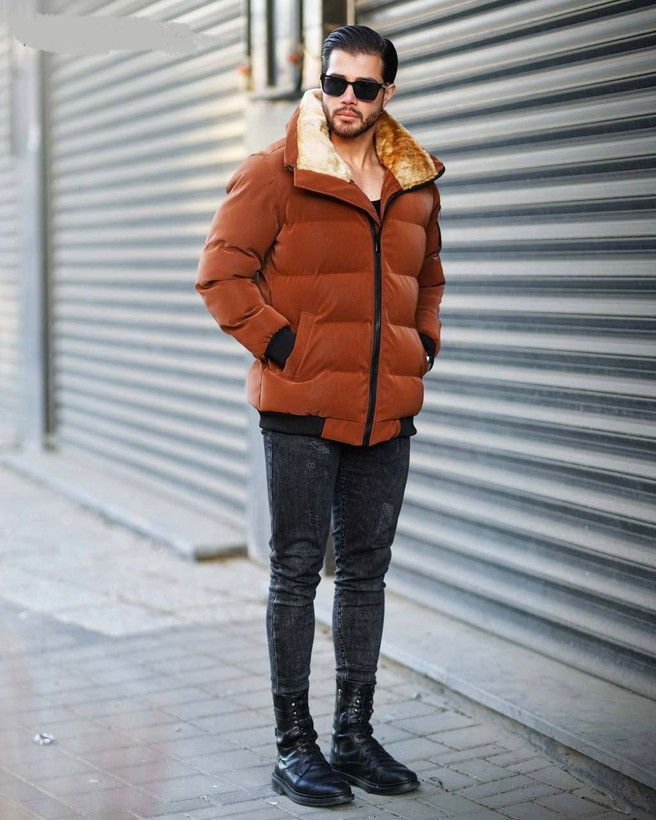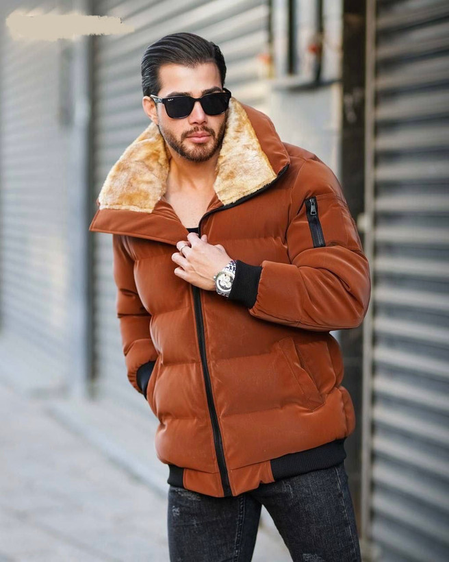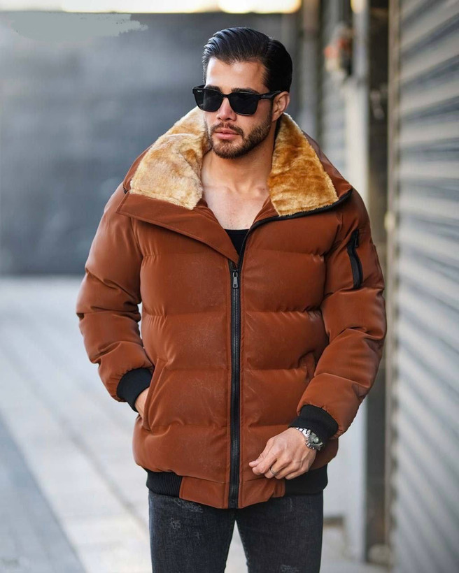 کاپشن مردانه یقه بلند خز دار مدل پوست ماری جنس چرم سیلیکنی وارداتی اصل